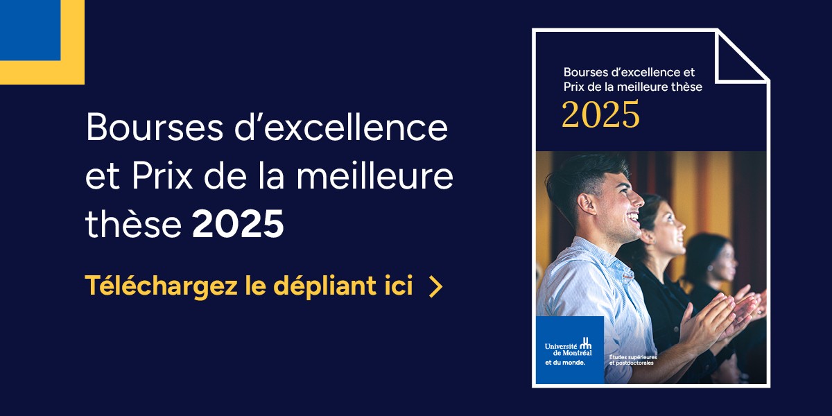 Nous vous invitons à découvrir ce microsite mettant de l'avant les Bourses d'excellence 2025 à travers des témoignages de boursières et de boursiers, un message de madame Julie Carrier, vice-rectrice adjointe aux études supérieures et postdoctorales, la liste des boursières et boursiers 2025, ainsi qu'un message pour nos généreux donateurs et donatrices.