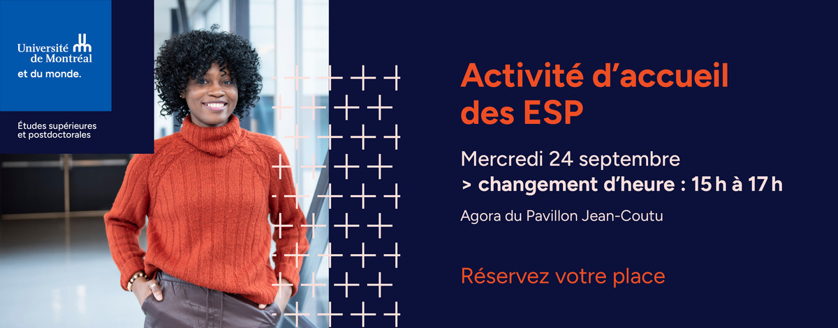 L’équipe du vice-rectorat adjoint aux études supérieures et postdoctorales (ESP) vous invite à son Activité d’accueil le 24 septembre, de 15 h à 17 h (HNE), à l’Agora du Pavillon Jean-Coutu, afin de célébrer la rentrée d'automne 2025 !